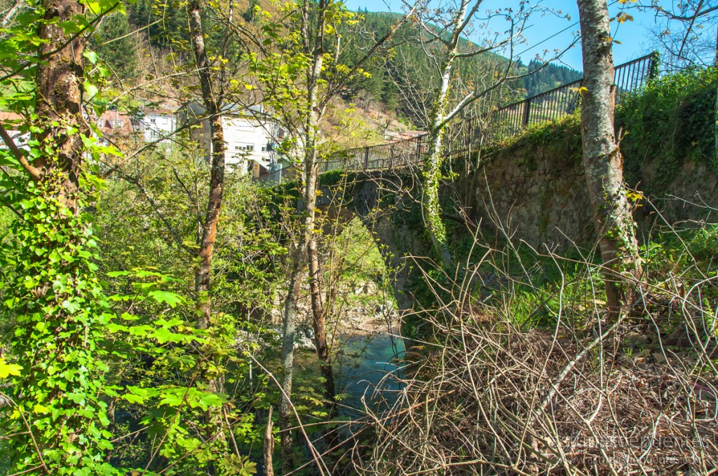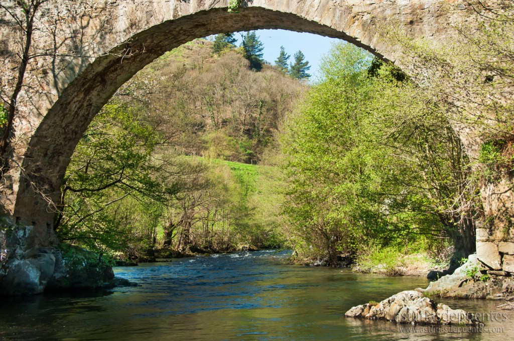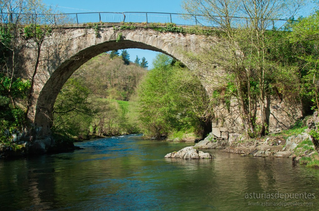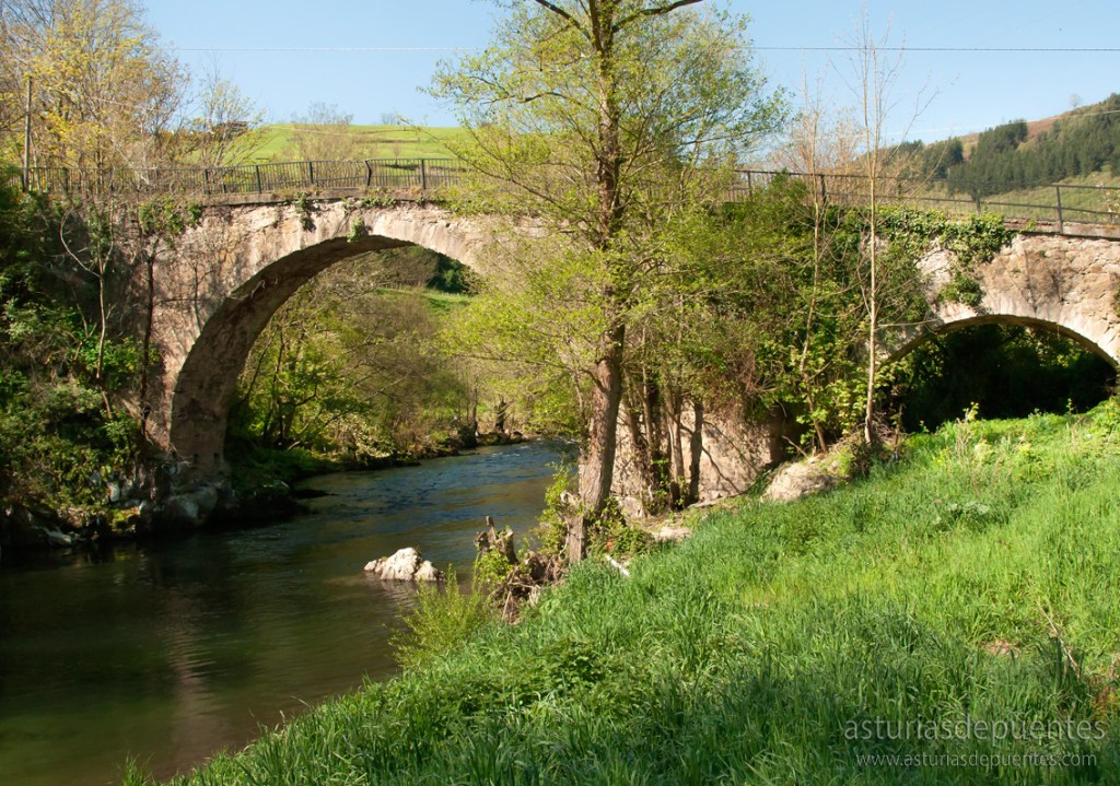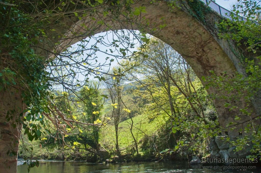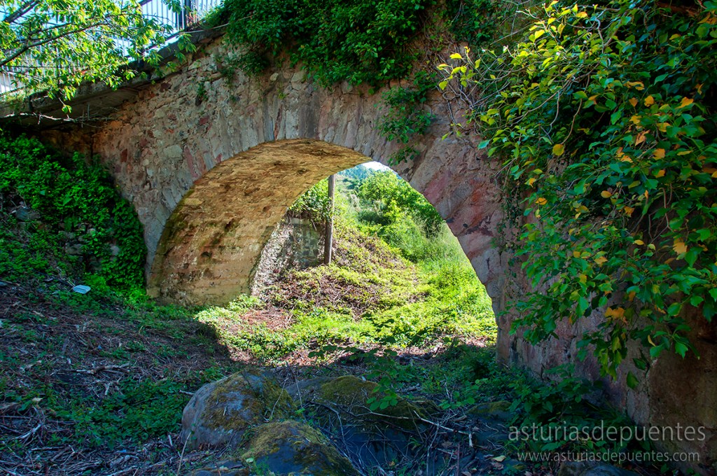 Aquí tenemos nuestro próximo puente medieval (43.24158, -6.50178), con un gran vano central y otro más pequeño. Su construcción data de entre los siglos XIII y XIV. El estado de conservación no es malo, aunque está parcialmente oculto por la vegetación.
