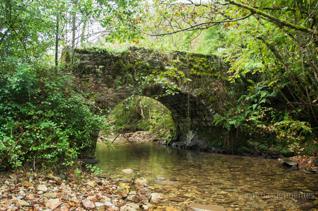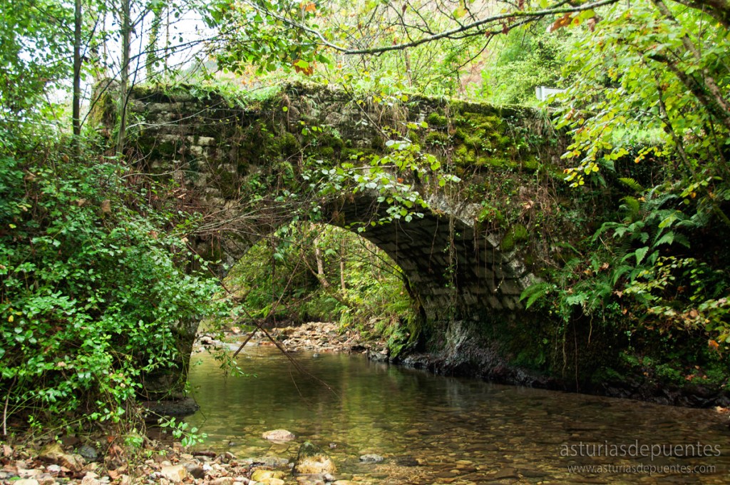 Cruzando un puente hacia la otra orilla del río, acompañamos el curso del mismo aguas abajo, hasta llegar a una pequeña edificación, enfrente de la cual se encuentra el puente (43.31544, -5.06948).