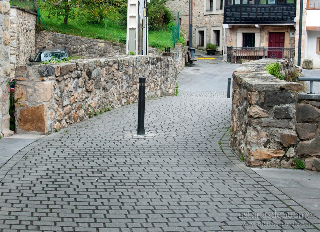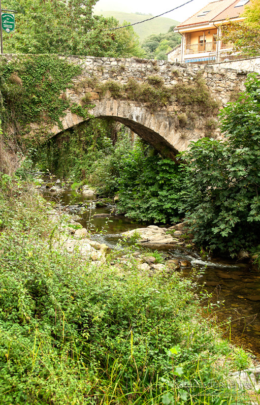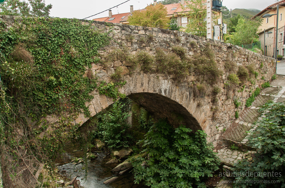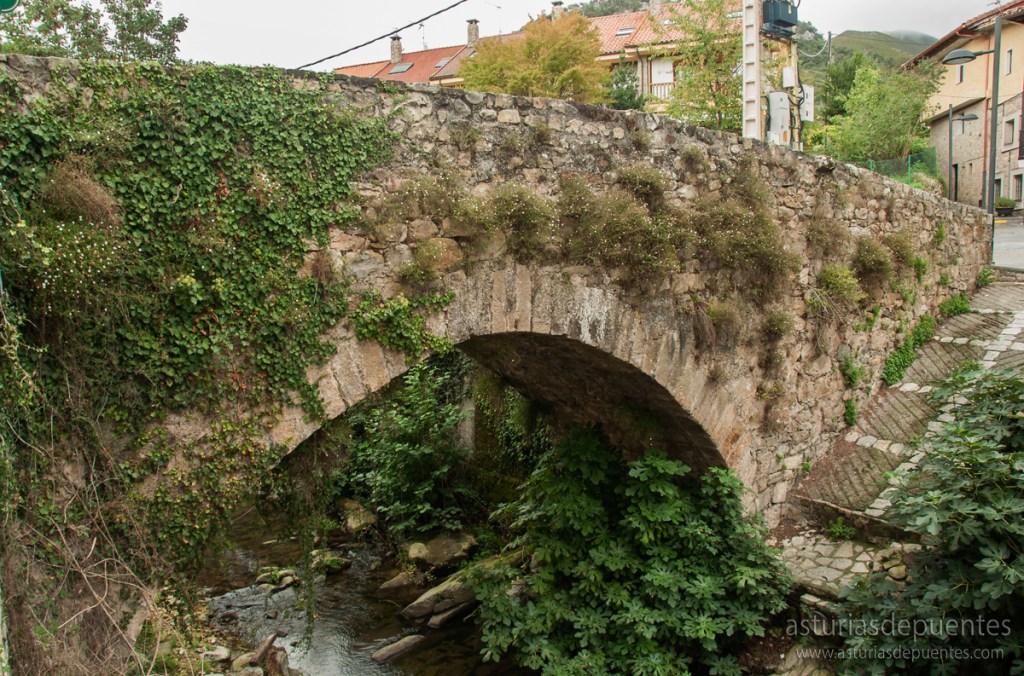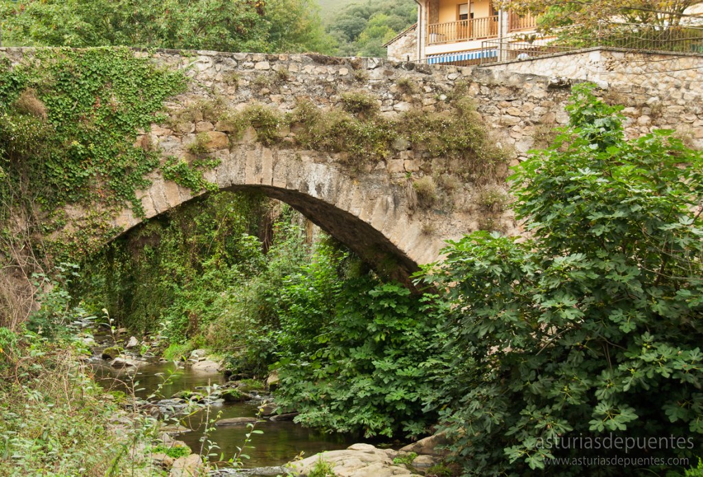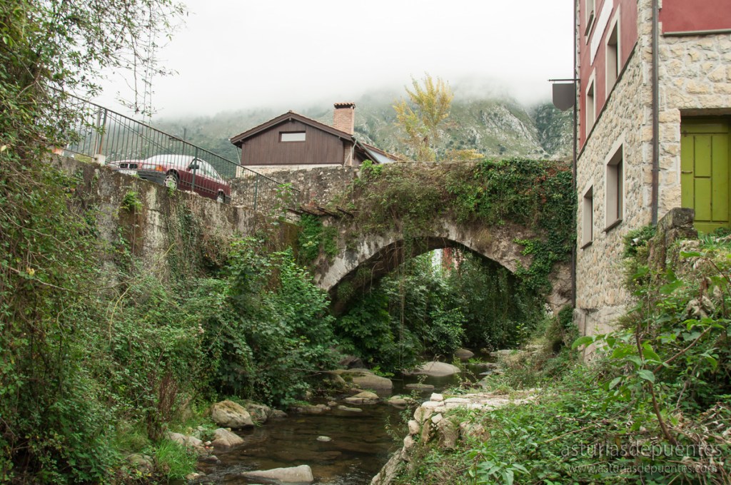 Al fondo de la plaza y a nuestra derecha nos encontramos con el puente. Probablemente su construcción data entre los siglos XII y XIII. De un solo arco, en buen estado de conservación, con algo de vegetación y su firme restaurado con piso de nuevos adoquines, es un punto de referencia a tener en cuenta en uno de los enclaves más visitados del concejo de Cabrales.
