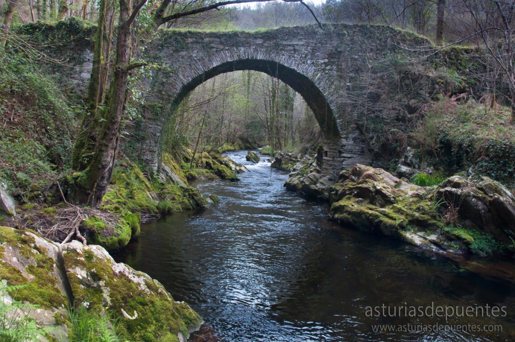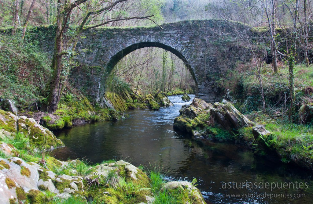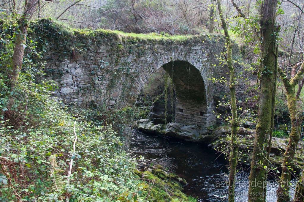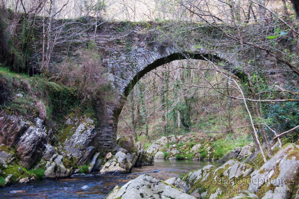 Después, debemos retroceder caminando en dirección a Navia poco más de 200 metros, con precaución por la carretera, ya que no tiene arcén, y vemos un camino que se adentra monte abajo. Enseguida llegamos al Puente Polea (43.41671, -6.71511), de un solo arco y de origen romano.