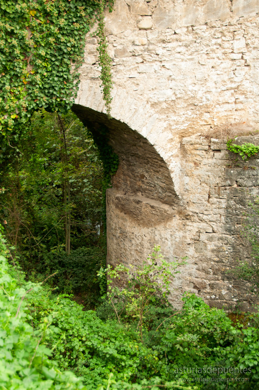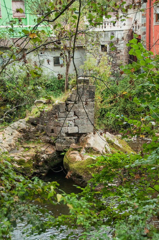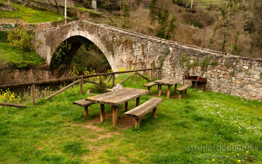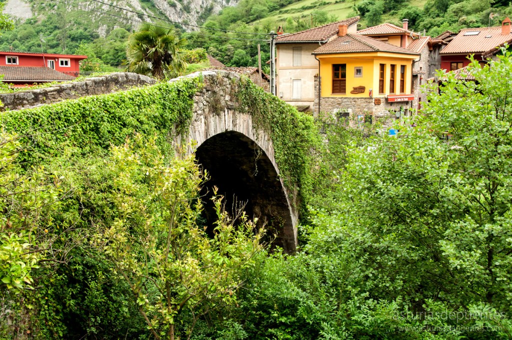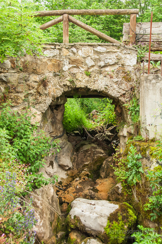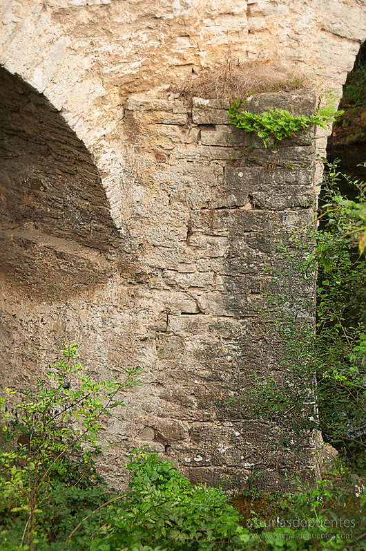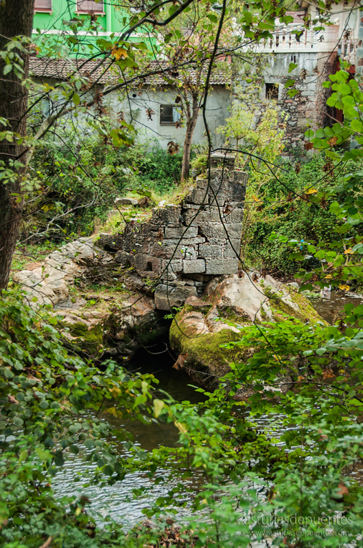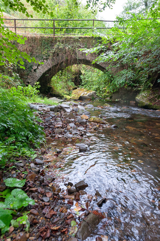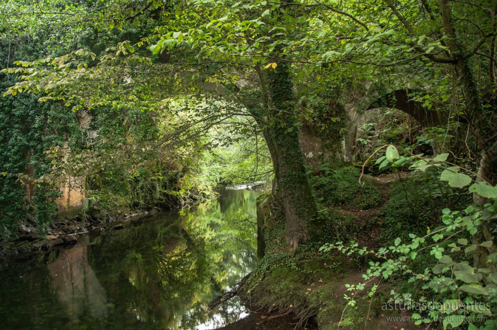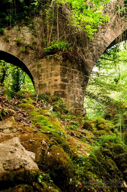 Una vez que hayamos aparcado, caminamos por la carretera hasta pasar por encima del puente nuevo sobre la carretera AS-228 para, una vez cruzado el puente, tomar un camino de tierra a la derecha que nos lleva hasta debajo del puente donde, después de bajar con cuidado hasta el curso del río, nos encontramos debajo de los arcos de piedra del puente viejo. Una estructura de grandes dimensiones y de gran atractivo, a pesar de estar eclipsada por el puente por el que transcurre la carretera. Debemos tener precaución al movernos por el lugar, ya que se resbala con facilidad debido a la humedad de las rocas, con verdín y musgo abundantes.