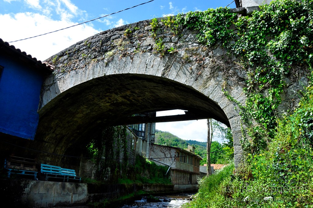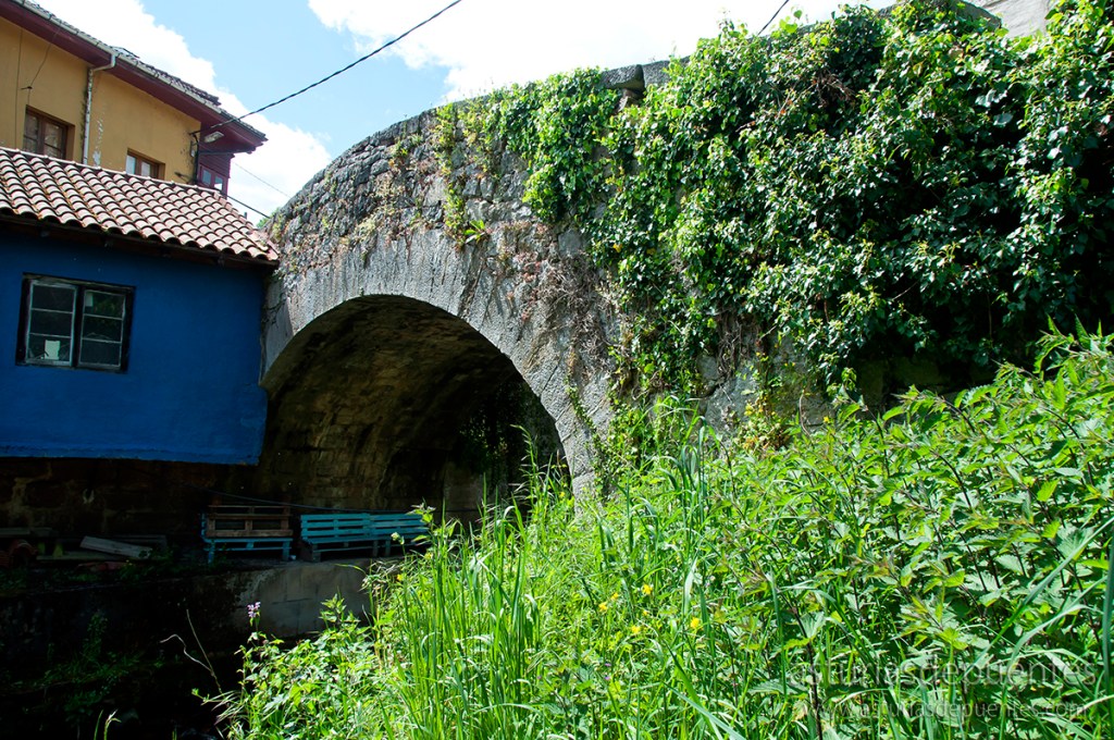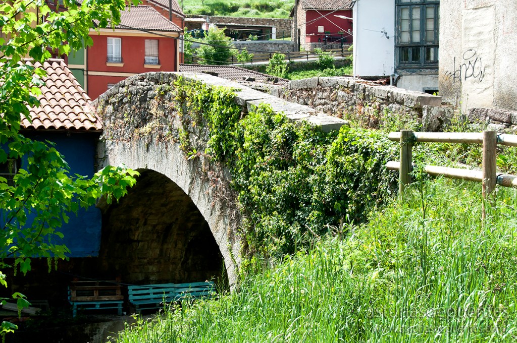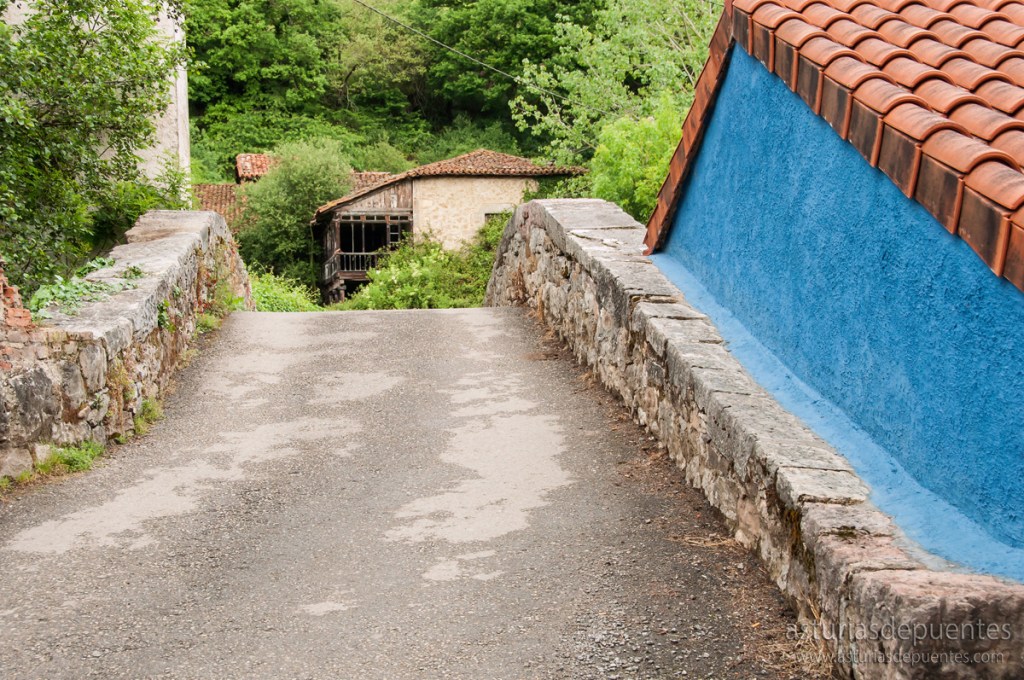 Caminamos unos 200 metros y llegamos al núcleo del pueblo, donde a la izquierda hay un lavadero y una fuente. Un poco más adelante nos está el Puente Medieval de Villanueva (43.27394, -6.00117), de un solo arco y perfil de doble vertiente apuntada y en buen estado de conservación que podemos fotografiar desde varios ángulos. Si cruzamos al otro lado y, cuando estamos en lo alto del puente, tenemos una vista del pueblo entero, multicolor, con sus casas muy cuidadas y muchas de ellas de construcción típica asturiana, con corredores de madera, así como varios hórreos en muy buen estado de conservación.