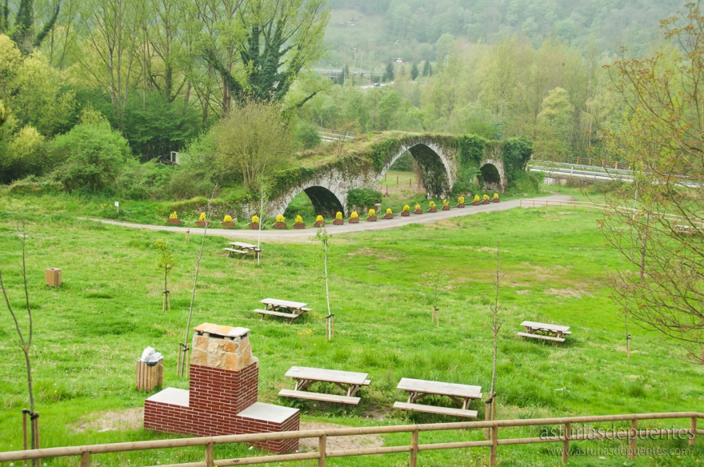 A la entrada del núcleo urbano a través de la mencionada AS-375, podemos ver un área recreativa, en cuyo fondo luce el Puente de Olloniego (43.30061, -5.82888), con sus 3 arcos visibles, ya que en un pasado tuvo 5. Dos de ellos desaparecieron por una riada en el siglo XVII.