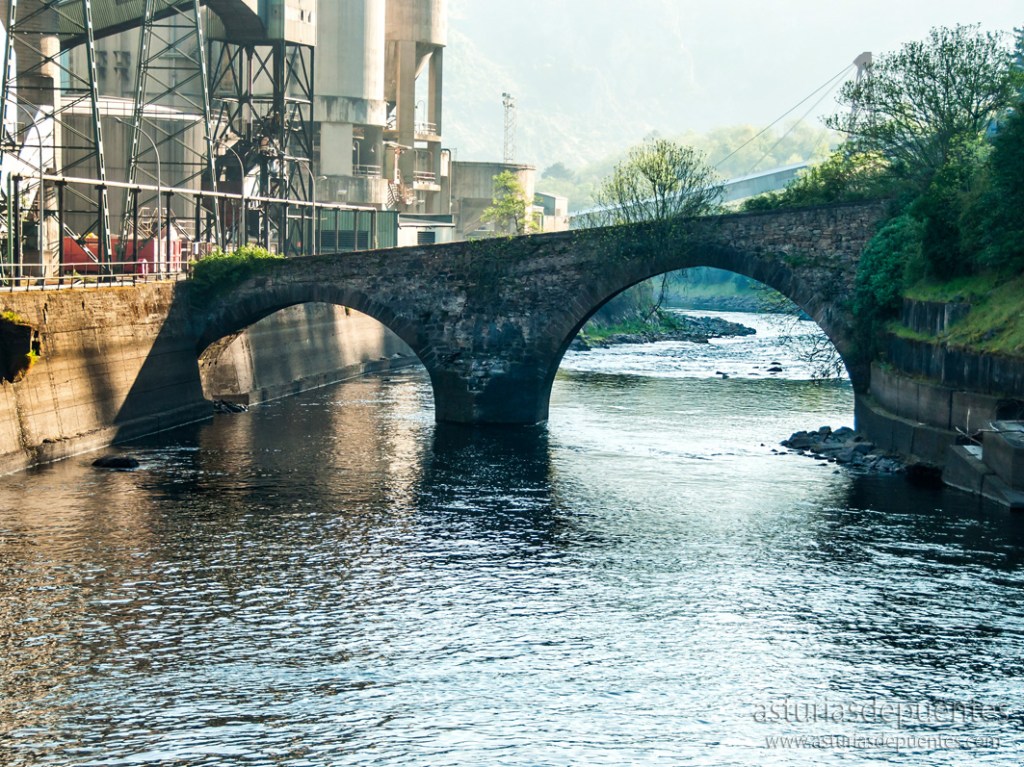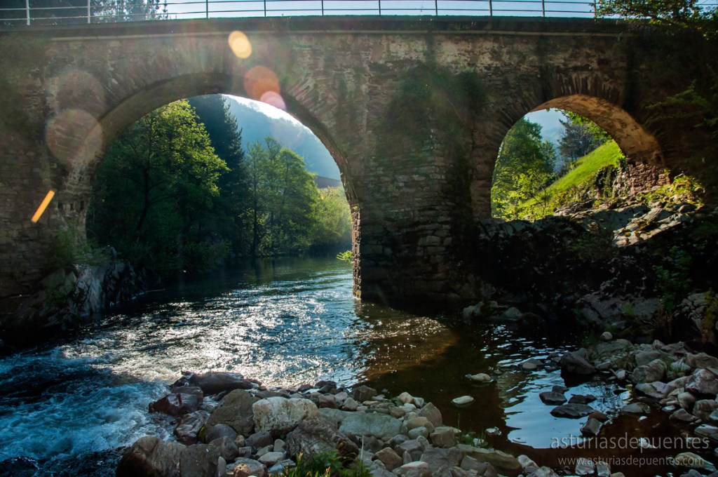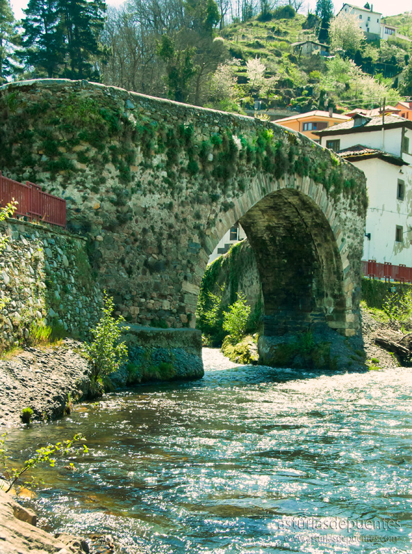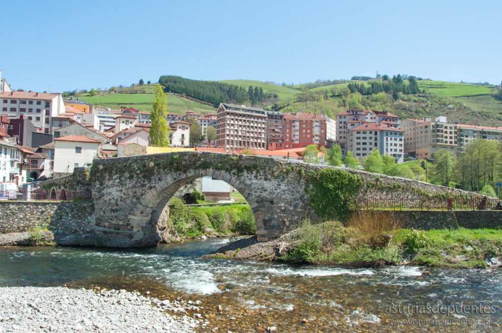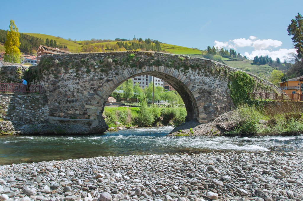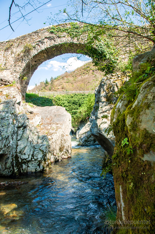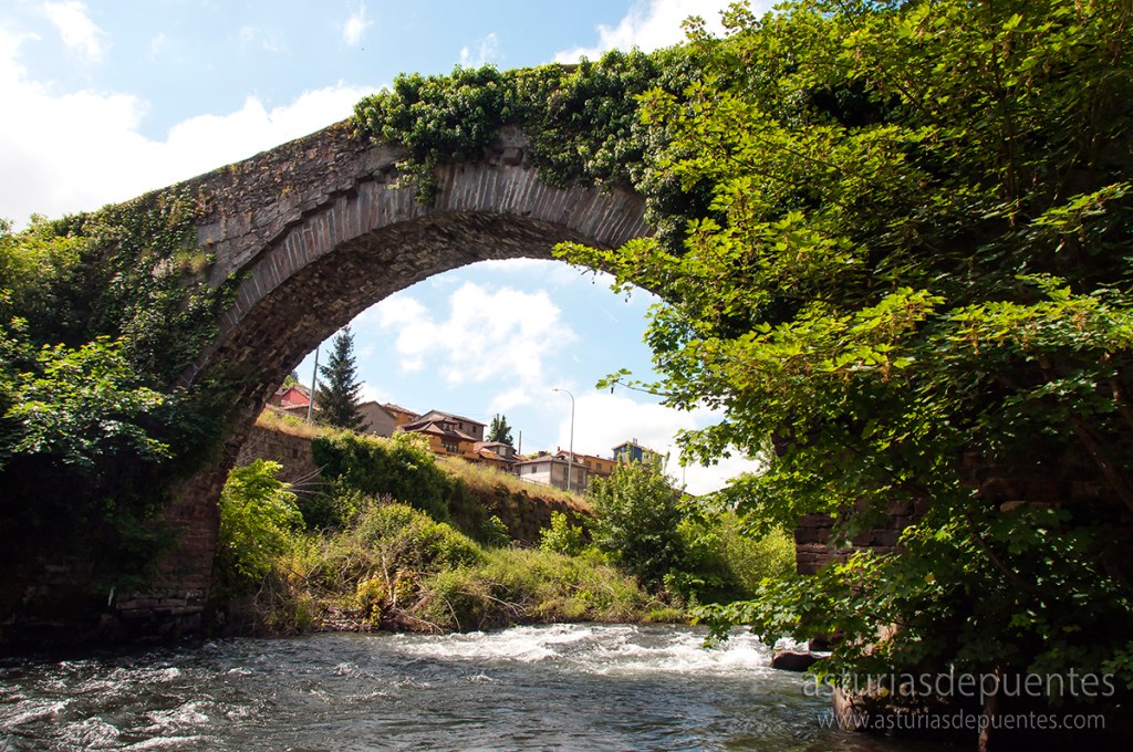 Se trata de un puente de varios arcos, aunque solo uno de ellos tiene el privilegio de que las aguas del Río Naviego pasen bajo el mismo, en la confluencia con el Río Narcea. Data del siglo XIII y su estado de conservación es muy bueno, incluido el empedrado por donde podemos pasear, disfrutando de un entorno atractivo y desde donde se puede ver la imagen de los cuatro puentes: el puente colgante, el puente de la AS-15, el puente de la carretera a Besullo y un puente peatonal, el más cercano al puente medieval, que comunica las calles Acceso de los Nogales con la Calle La Veguetina.