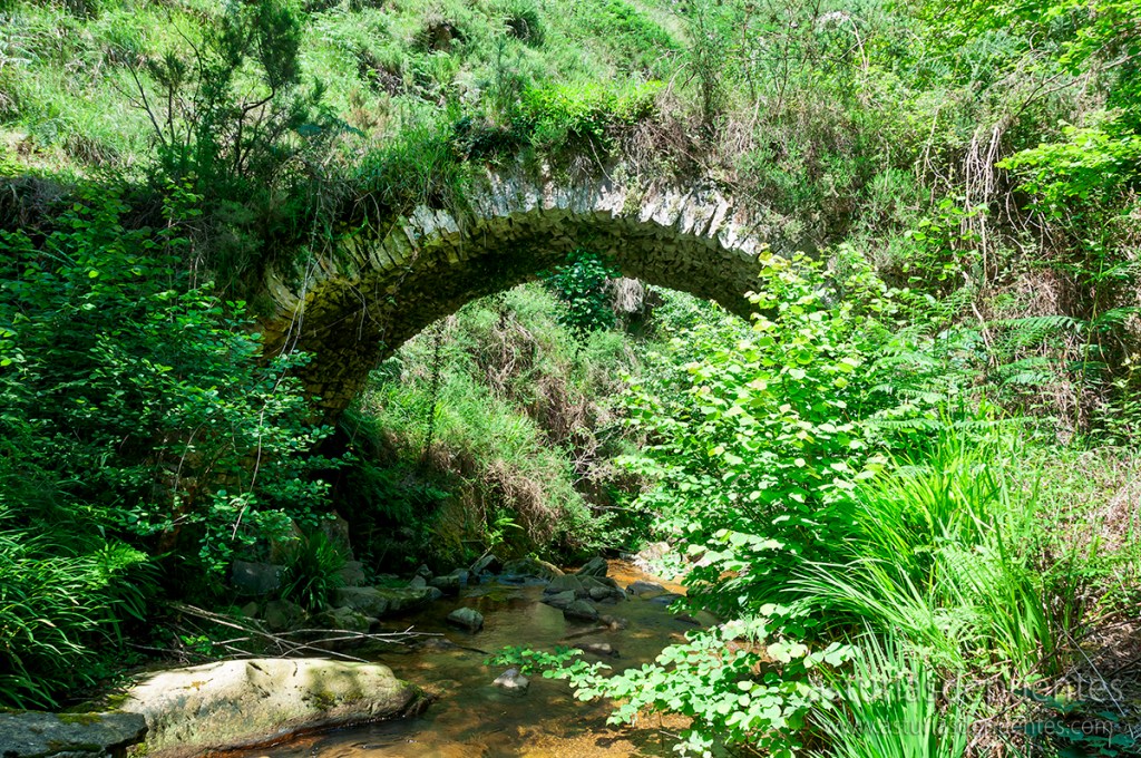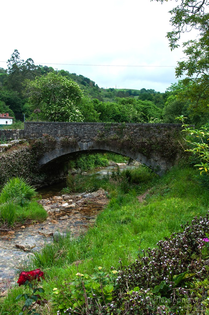 Llegamos al Puente de Intriago (43.34437, -5.04602). Consta de dos arcos y su estado de conservación es bastante bueno. Salva el curso del río Güeña y sirve de acceso rodado al interior de la localidad que le da nombre.